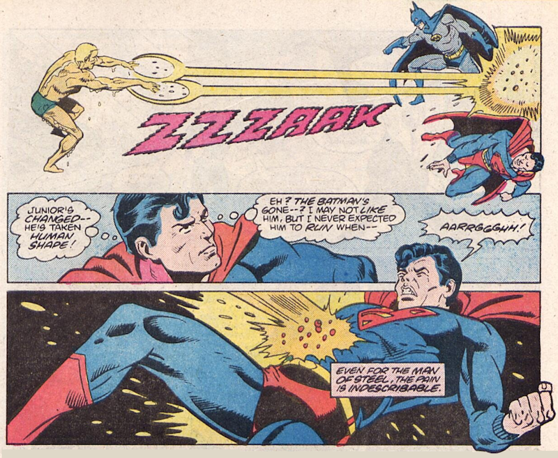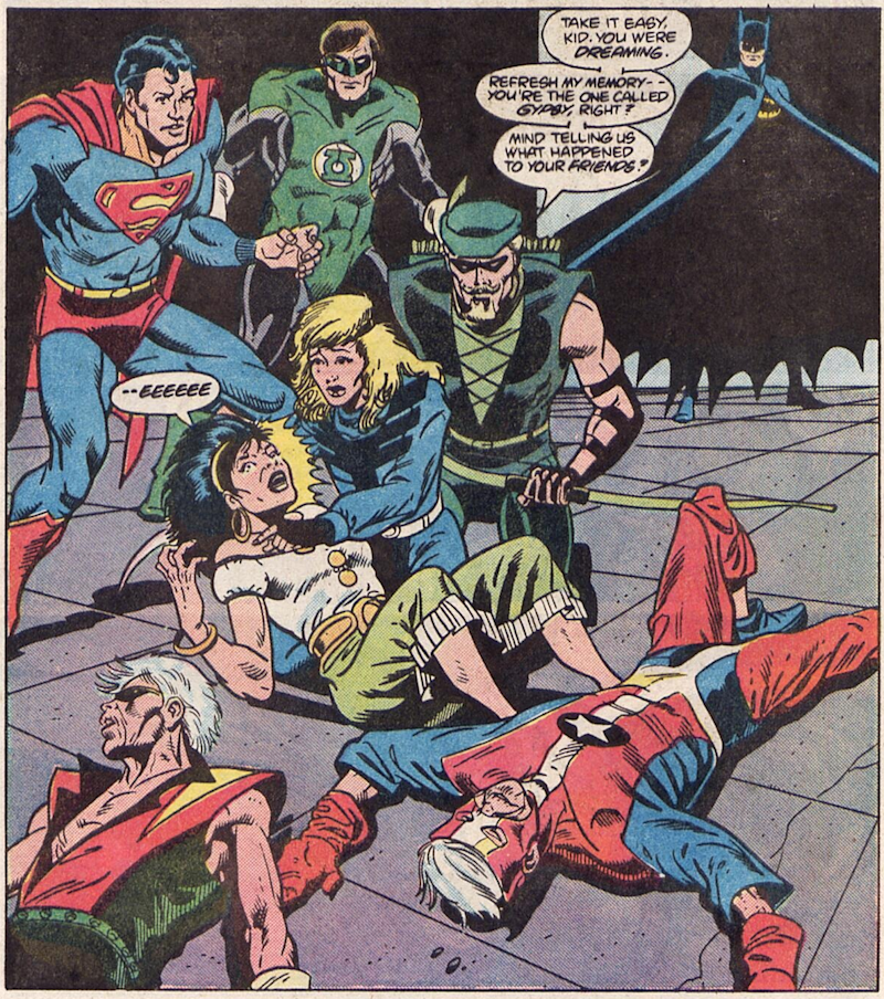The old Leaguers are succesful in finding Junior who has by now transformed into a golden skinned man. As Black Canary treats Gypsy and the others, Junior attacks Batman and Superman leading to an interesting thought from Superman: