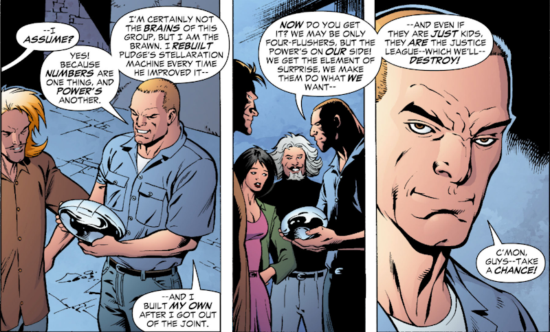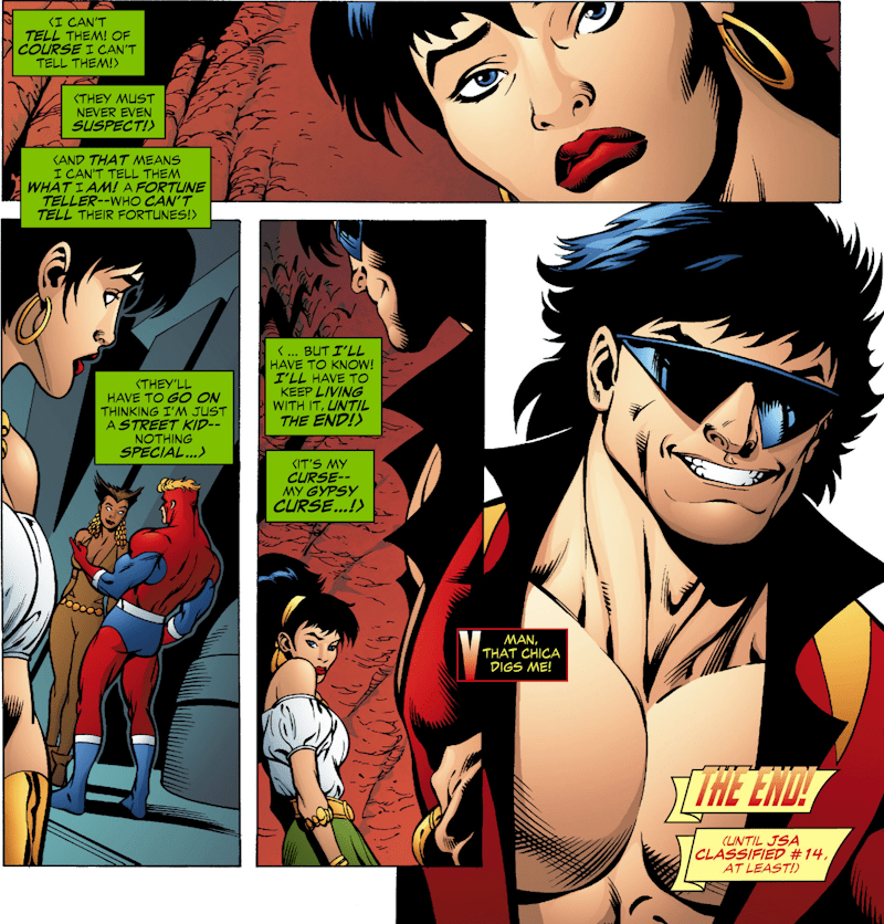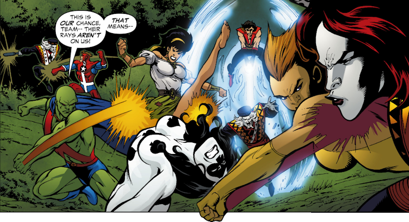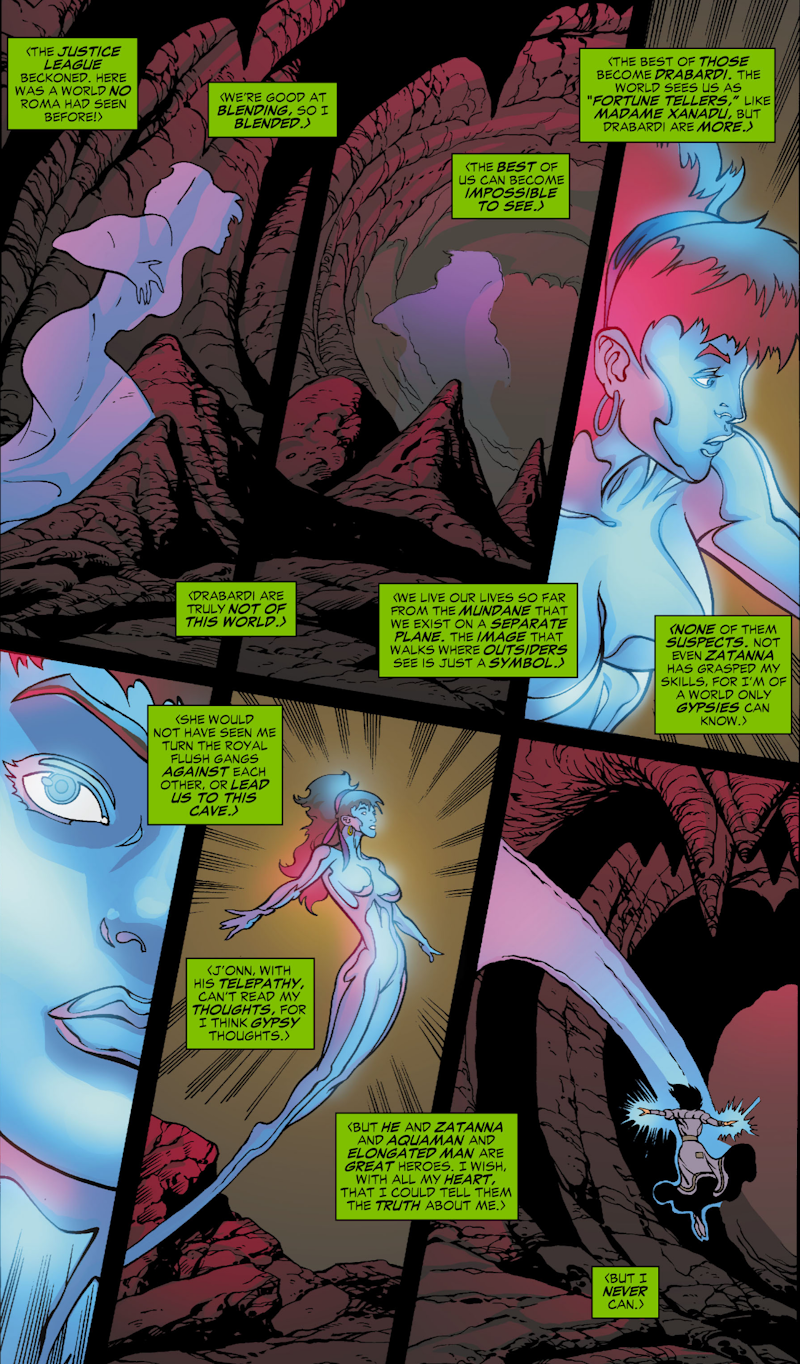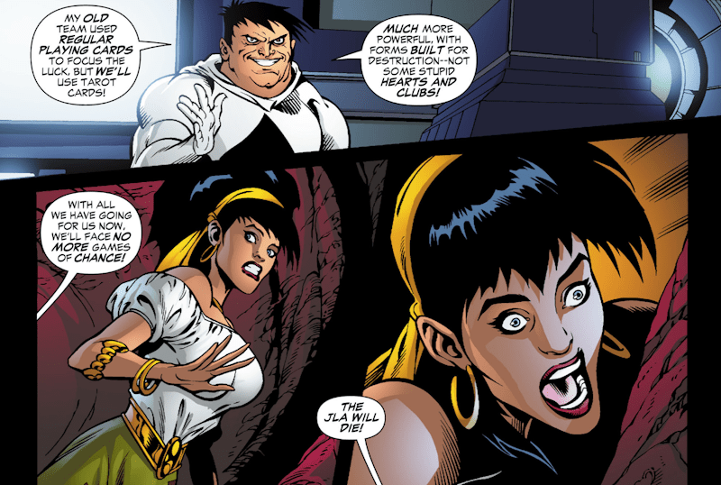 and using her Gypsy powers, she summons the rest of the League to her location without actually admitting it was her. They attack the Gang who transform themselves into living avatars of various Tarot cards and after a long fight, the new Leaguers are backed up to the edge of a chasm when, for absolutely no reason whatsoever, this happens: