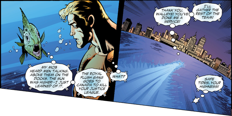 With the fighting over, Aquaman finally arrives in time to . . . well, to say sorry for taking so long, really. Meanwhile Gypsy has a prophetic vision of Vibe and Steel laying dead, and mopes around about how she can’t tell them their future.