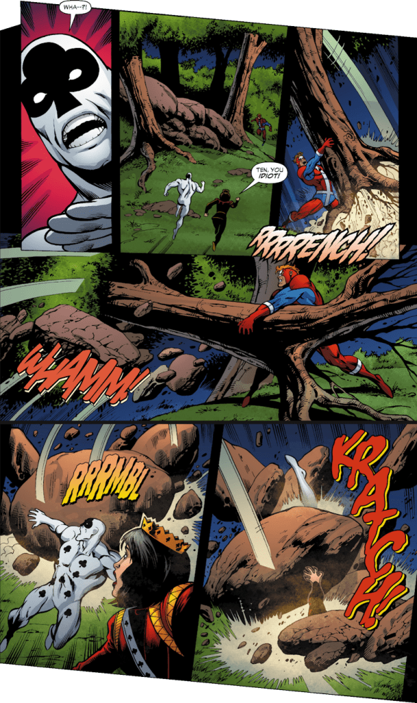 With a last > koff! < the King of Spades – who’s been coughing the whole way through this story – has a heart attack and dies, forcing Fortune to shut down his Tarot-inducing-luck-machine-thing, leaving them wide open for a final attack by the League with Fortune himself being taken down . . .
