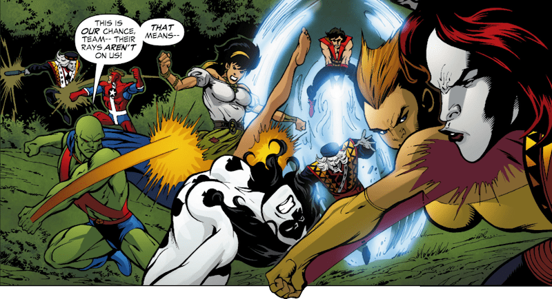 All of which results in a huge forest fire breaking out, both Gangs running away and leaving the League trapped by flames which, unsurprisingly, render J’onn unconscious immediately.