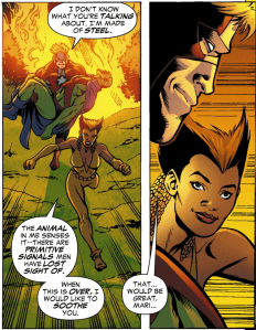 In JLA CLASSIFIED #24 Aquaman arrives, landing his plane near the fire and swimming up a nearby stream in the hopes that it will lead him close to the League’s camp. As the two Gangs head for their respective hideouts, the League take advantage of Vixen’s animal senses and attempt to escape the fire. During this, Englehart dishes up his second continuity error, implying an attraction between Vixen and Steel which simply never happened during the original run.