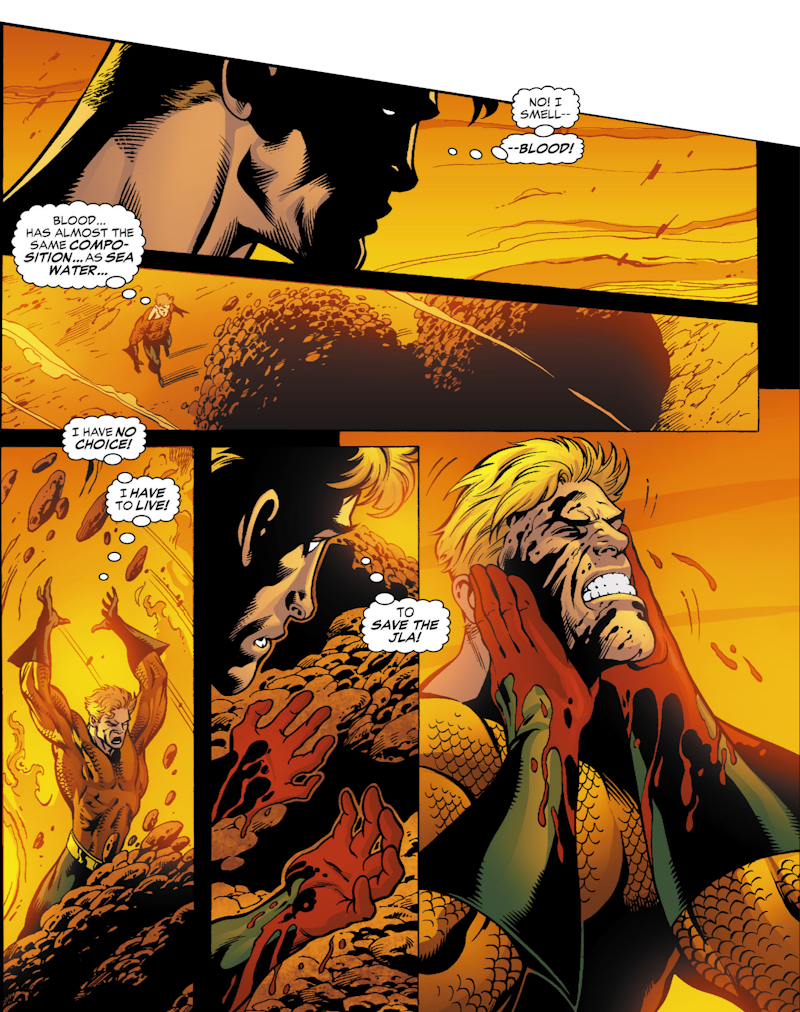 Yep, that’s Aquaman smearing his face with the blood of dead villains in order “to save the JLA!“