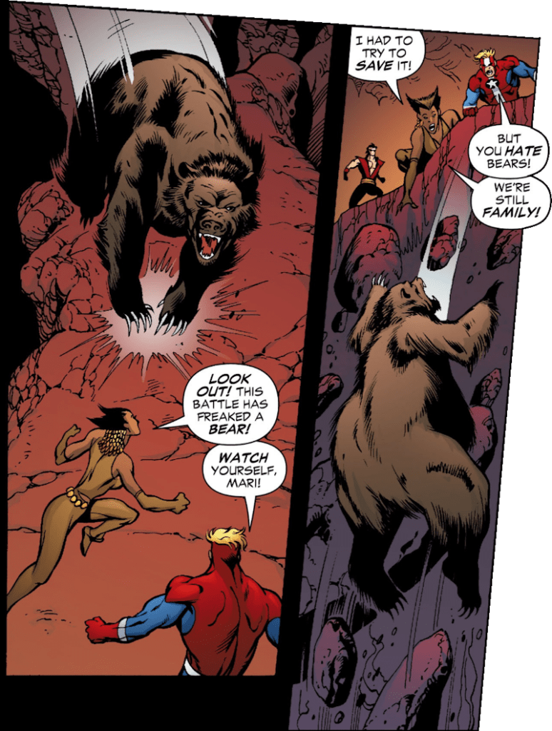 Frankly, this is a dreadful story arc with heroes acting out of character, continuity errors all over the place and a bear falling into a chasm.