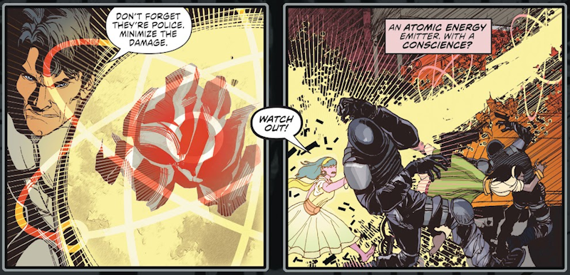 Issue 1 starts with Elongated Man’s powers having returned (prior to the cities being opened up, all metahuman powers were negated) and him heading out to team up with the rest of the Detroit League. And it only takes four pages until we get this: