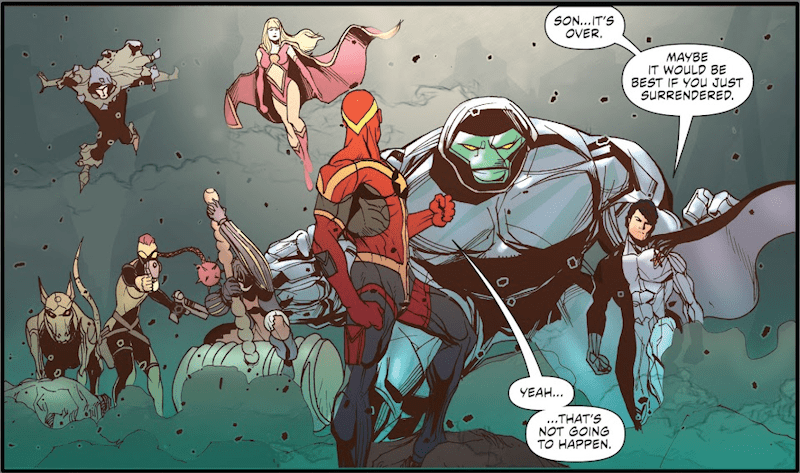 The Six regroup and, despite the League’s best efforts, get them to the point of surrender when Sue’s plan works out and Zatanna, Aquaman, and Martian Manhunter take out the bad guys.