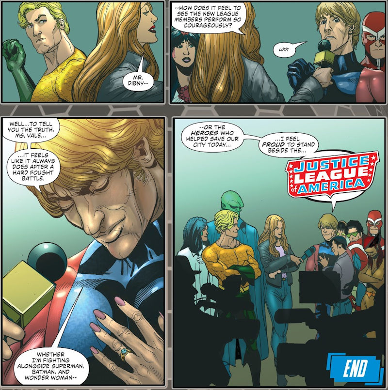 Vicki Vale, who has been reporting on the fight the whole time and been insulting to the League, arrives moments later and wants to speak to the heroes who defended the city. Aquaman attempts to speak but we see her pass him and get this: