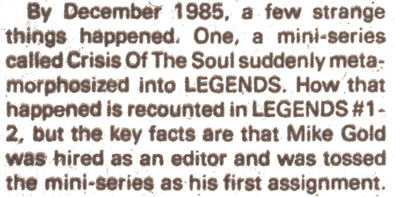 In the editorial piece at the back of LEGENDS #1, editor Mike Gold recounts how Executive Editor Dick Giordano got in touch with him and asked him “How would you like to do CRISIS 2?“