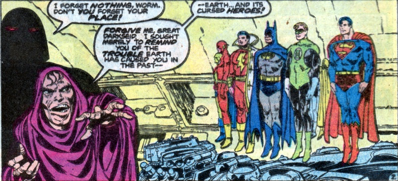Cover: In the background, dominating the scene, is Darkseid, lord of Apokolips.
