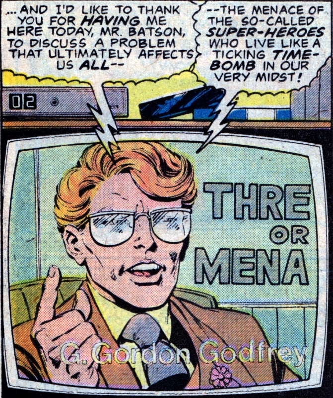 Page 9 – Panel 1: Our first glimpse of G. Gordon Godfrey, the alter ego taken on by Glorious Godfrey for Darkseid’s “Operation Humiliation”. Godfrey has already been seen putting forward his anti-superhero message by this point in the first couple of crossovers. The “Mr Batson” he refers to will be seen in the next couple of pages. On the wall behind him appear to be the words “threat or menace” which seems one-sided for any sort of debate.