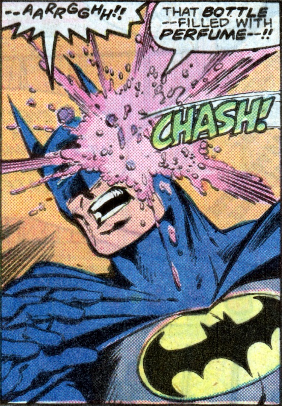 Page 13 – Panels 3 to 5: Batman is blinded by a bottle of perfume, presumably thrown by someone in the mob.
