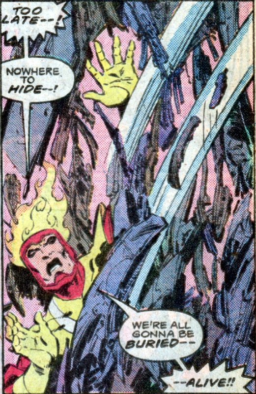 Page 9 – Panels 3 and 4: The rubble from the building proves too much for any of the League, or Cosmic Boy, to handle and the heroes are buried beneath it.
