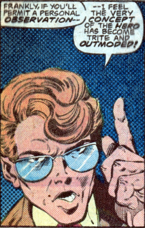 Page 2 – Panel 2: Tate introduces G Gordon Godfrey and describes him as a “noted psychologist” and an author of a “bestselling” book. This apparent problem of whether Godfrey has been on Earth long enough to become both noted and an author could be solved by claiming Godfrey’s hypnotic powers are making people believe his backstory.