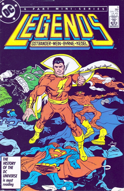 Cover: Front and centre is Captain Marvel while surrounding him are the empty costumes of various heroes. Clockwise from the top right (just under Marvel’s cape) are the costumes of Changeling; Flash; Batman; Black Canary; Superman; Blue Beetle; and Green Lantern Guy Gardner.
