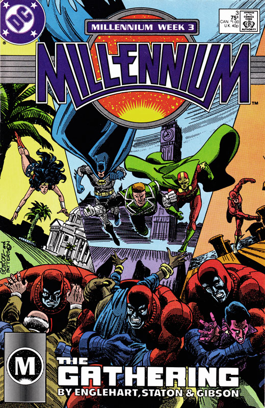 Middle: Batman, Green Lantern Guy Gardner and Mr Miracle at the top, with a Manhunter attacking Celia Windward.