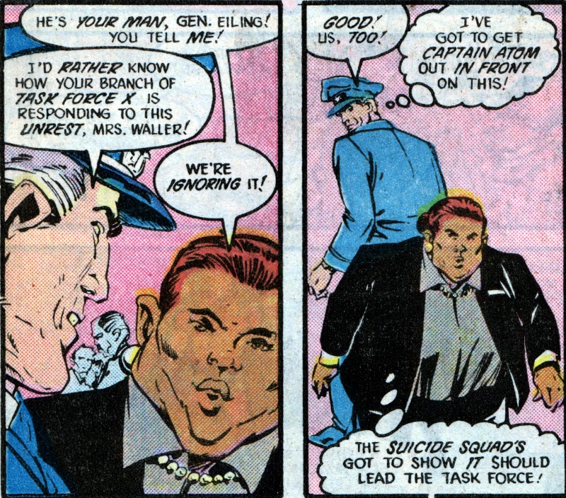 Page 13 – Panel 2: Hadley is as aware of Booster’s Manhunter as we are. In the corner are General Eiling and Amanda Waller.