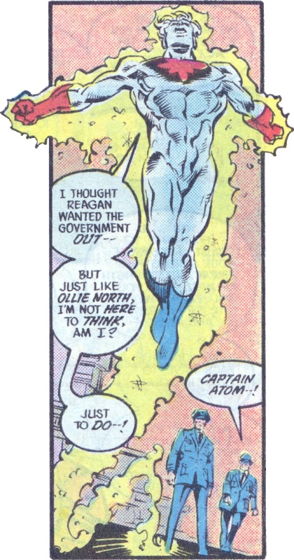 Page 7 – Panel 4: Captain Atom clearly struggles with being an obedient soldier, but accepts that he has to obey orders. His mention of “Ollie North” is in reference to the Iran-Contra Affair. The figure approaching in the bottom left is . . .