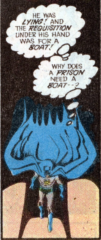 Page 13 – Panel 4: Not only did Batman know he was lying, but he managed to read the paper showing the boat’s requisition which makes him suspicious. “Why does a prison need a boat?” he wonders, missing the point that the prison in question is based in a swamp and, should a prisoner escape and need to be found, land based vehicles wouldn’t be the only thing that would come in handy.