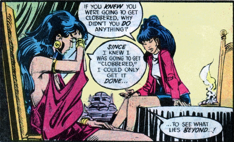 Page 16 – Panel 5: Xanadu’s odd behaviour is explained as being her knowing she would be attacked and allowing it to happen.