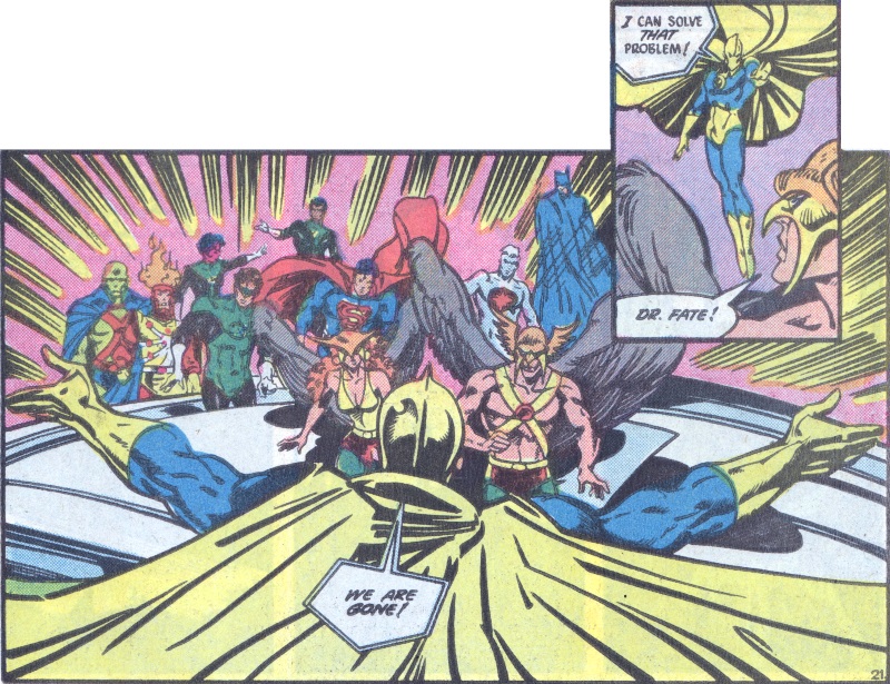 Page 21 – Panels 4 and 5: Did anyone order a deus ex machina? Dr Fate arrives and transports the team off the face of the Earth.