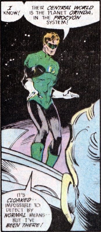 Page 17 – Panel 1: And only now does GL Hal Jordan remember that he knows where the Manhunters secret home world is.