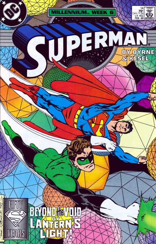 Following the events of MILLENNIUM #6, Superman and Green Lantern are tracking the Highmaster, leader of the Manhunters, who is heading to the dimension where the Guardians and Zamarons have been living since they left the universe to procreate, in order to kill them. They find a massive platform that was created by the Guardians and Zamarons but are attacked by the Highmaster, Superman tricked into burrowing in circles beneath the surface, while the Highmaster attacks Green Lantern.