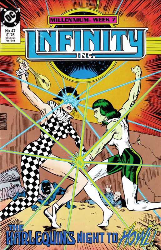 Back in California, Obsidian is attacked by the Harlequin, apparently the last remaining Manhunter agent who somehow escaped from the Manhunter lair in MILLENNIUM #7. Jade attempts to stop her, but it is her grandfather, Dan Richards, who stops her killing the Infinitors, although he is shot by her in the attack and dies in Jade’s arms.