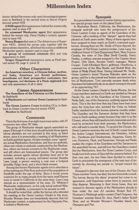 The two issue MILLENNIUM ILLUSTRATED INDEX was useful as I was going through the series, allowing me to capture one or two characters that I’d missed in some of the crowd scenes, and the synopses of the issues, both main and crossover, helped solidify my own thoughts in a few instances.