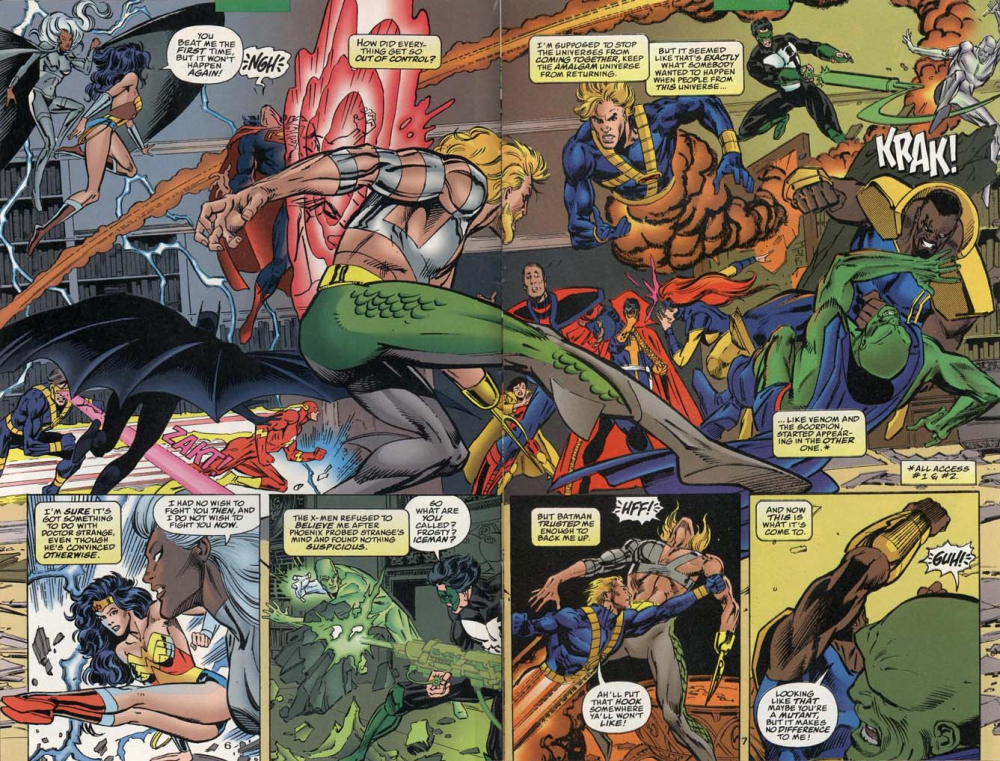 Access has been trying to find out which of the heroes or villains from the respective DC and Marvel universes have been trying to bring back the Amalgam Universe, the interim state that DC VS MARVEL created temporarily. All evidence points to Dr Strange (who insists he’s innocent) and when Access takes the JLA to tackle Strange, he’s protected by the X-Men . . . which of course leads to a big fight.