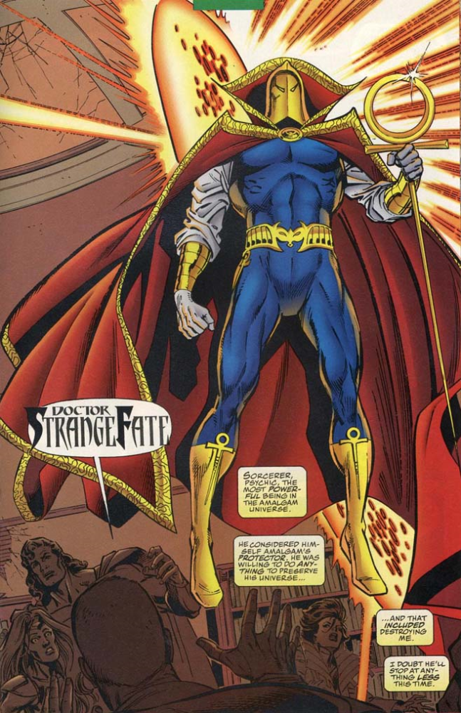 Dr Strange still exists within Strangefate and whisks Access to safety, bringing him to some astral plane where Access is able to rescue him and allow him to return and confront Strangefate. The amalgamations are undone and Dr Strangefate is dealt with in a humane manner: