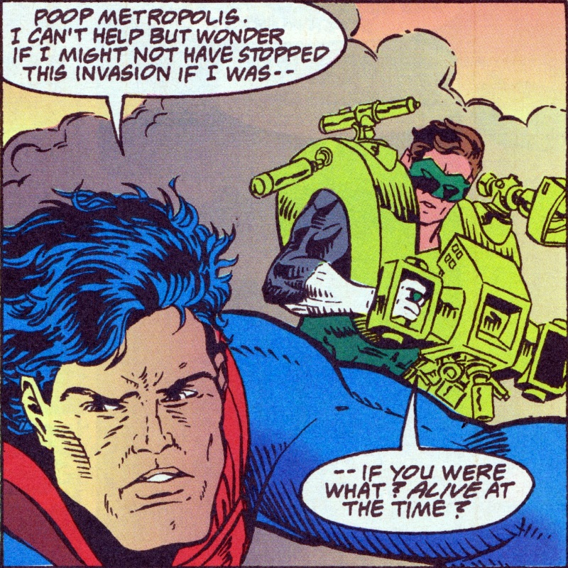 Maybe letterer Albert De Guzman was having a bad day, or maybe he was telling everyone he thought Bloodbath #1 (from whence this little nugget comes) stank . . . either way, Superman said “poop” and that was the only thing about Bloodlines #1 that made me smile as I was reading it yesterday.