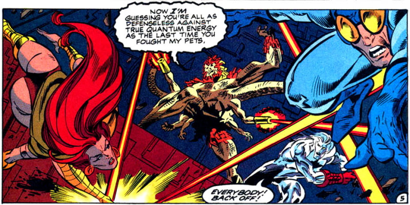This is at a time when the JLA had split into various factions and this one, Extreme Justice, had come up against a returned Monarch who was actually Nathanial Adam, not Hank Hall, and the Captain Atom we see in the image above is a clone made by the Quantum Realm that only thinks it’s Nathanial Adam . . .