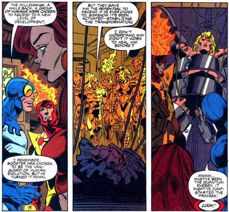 Back in the Judgment Day crossover (no, not that one) between the various Justice League titles, Booster had lost his arm and had now accepted the new Monarch’s offer to fix him but it was all a trap to allow Monarch access to the League’s HQ, hence the tentacles and blasters and all that. The team get him stabilised and, to their surprise, find that something good has come out of the MILLENNIUM crossover (yes, that one).