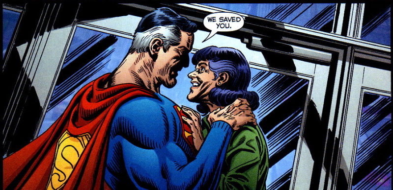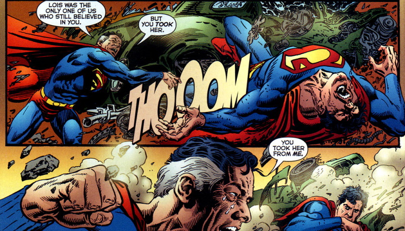 Back on Earth-2, Lois has died, driving Kal-L almost mad with grief, so much so that when Superman arrives and tries to help, Kal-L attacks him, blaming him for the death of his wife.
