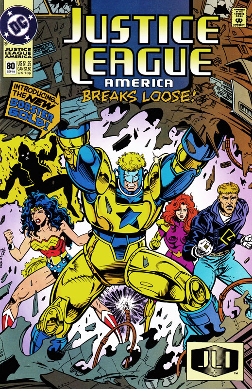 has apparently sold at auction for $80. Eighty dollars?! Why? For the return of Booster Gold in the worst outfit he’s ever worn?! The Dan Vado run on the JLA in the mid-90s had nothing notable in it apart from the death of Ice, and was followed by Gerard Jones who ran it into the ground about a year later.