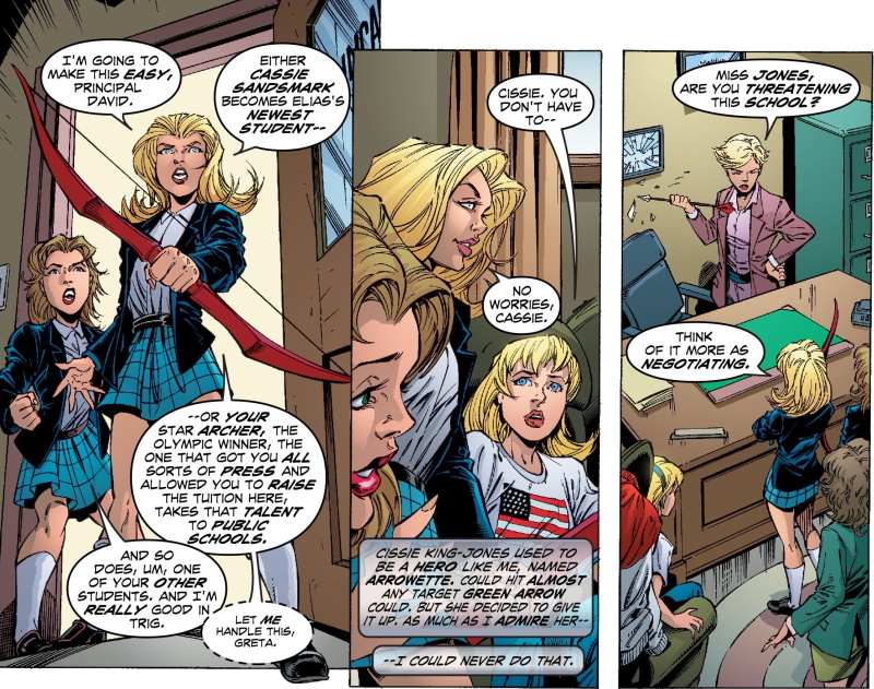 Wonder Girl has her own issues, though getting into school is helped by Arrowette (and Secret) striking a deal with the principal.