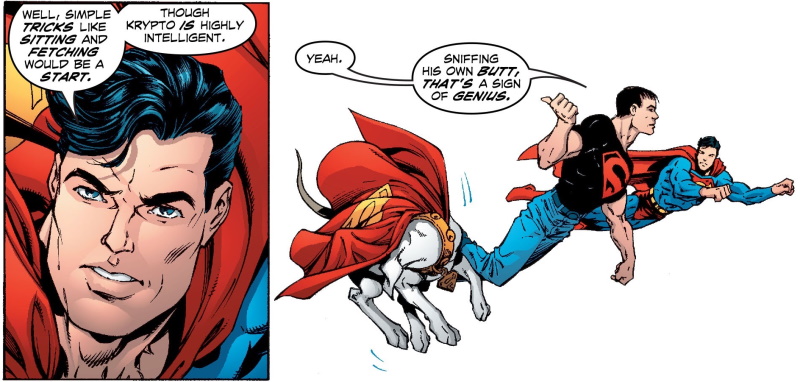 And Superboy gets a visit from Superman who gifts him Krypto to help him focus and get to grips with pretending to be a regular boy in Smallville during the weeks. Has to be said, Superboy’s not really that interested at first.
