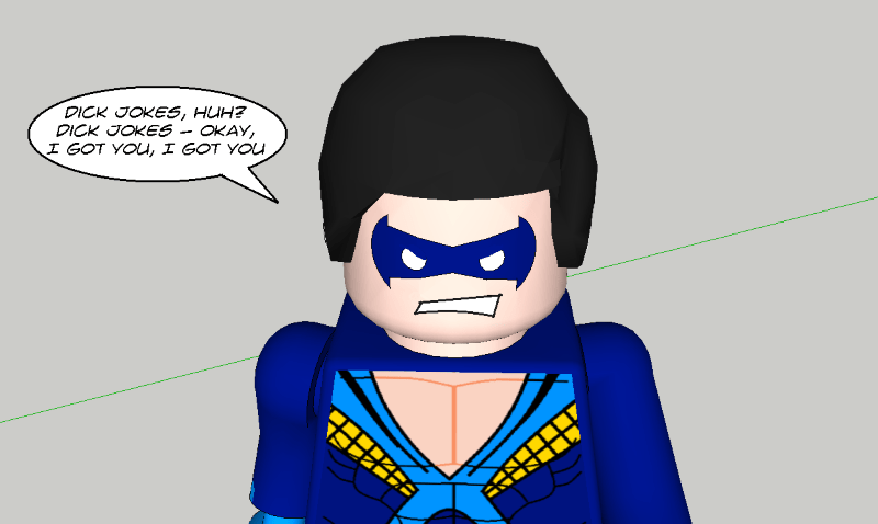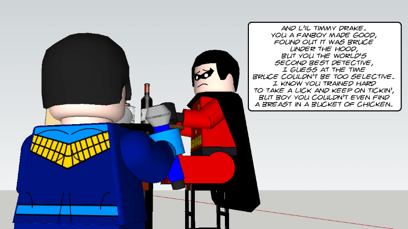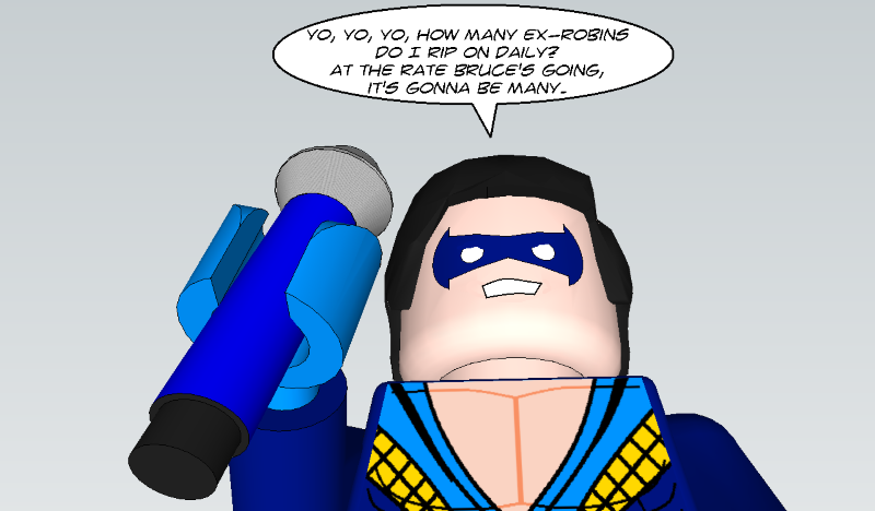 Fellow blogger Dale from Mr Morbid’s House of Fun (and major comment contributor on this blog) read the last Lego webcomic Boy Wonders and suggested that Nightwing be able to respond; I suggested to Dale that he come up with something and, in his own inimitable style, he scripted the following: