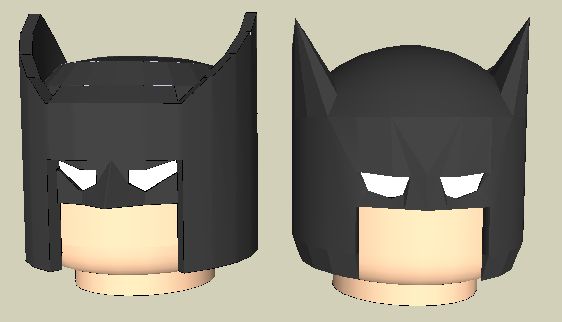 It’s a quiet time here at Earth-Prime – the Bloodlines annotations are done, I’m sorting out putting together some new shelving for my comic boxes, and gearing up to start the Millennium annotations in the new year – so I thought I’d hone my Sketch Up skills a little more by re-doing Batman’s cowl. The first version was drawn on by hand; the second version was modelled in Sketch Up and was better, but I wasn’t really happy with it. So here’s a comparison between version two on the left, and version three on the right: