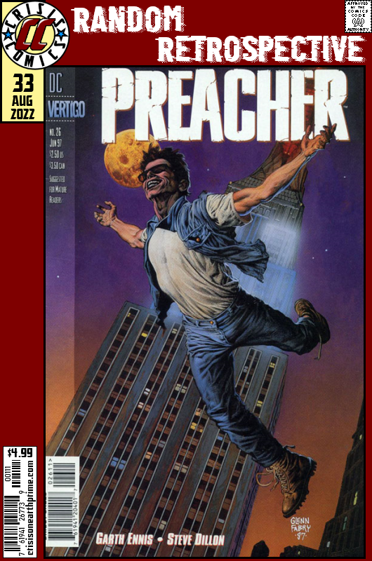 The Late lamented Vertigo imprint in the 90s was dominated, I think, by two titles – THE SANDMAN at the start of the decade, and PREACHER at the end of it. Both of them are fantastic series and I don’t mean to compare them with each other; THE SANDMAN has its roots in old and high fantasy which lends itself to a certain type of storytelling, while PREACHER is very definitely rooted in the (then) present, the world of Tarantino, violence and horror. One thing that Garth Ennis has over THE SANDMAN, though, is his ear for dialogue – this issue is mostly narrated by Cassidy, the Irish vampire, recounting his origin story to Jesse, and it’s full of profanity and wonderful turns of phrase and the occasional profundity as well.