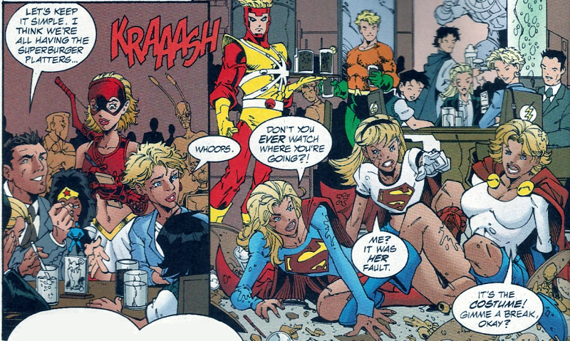 So here you go, a random couple of panels from a comic I recently re-read and which made me laugh – Ex-Arrowette Cissie King-Jones and others at a superhero themed restaurant where the waiters dress as heroes, leading to an encounter of multiple Karas.