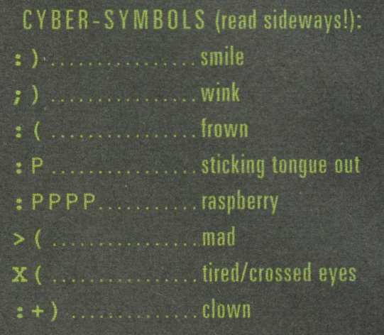 And look, for the newbies (was that even a word in ’95?) they produced a handy guide to “some computer shorthand symbols that will help you understand what some of the AOL cyberjocks are chatting about:”