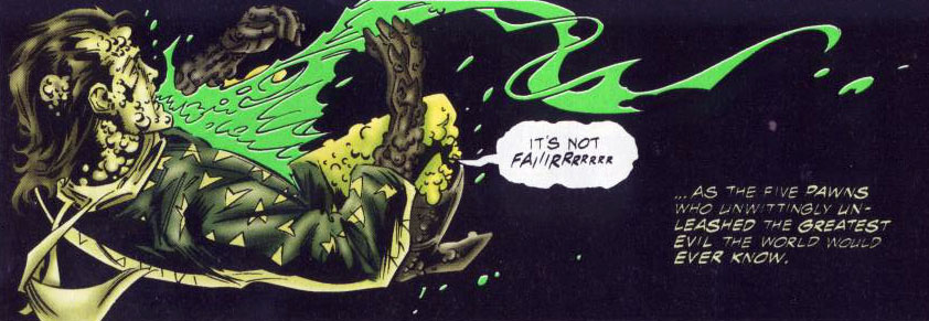 Page 38 – Panel 1: Again, the green vapour of the villains’ souls is taken from them and placed in the jar.