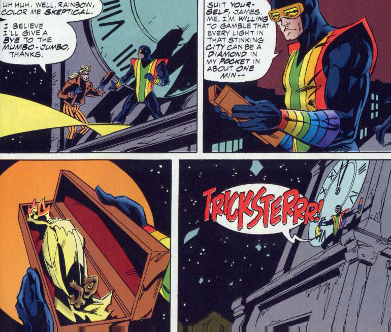Page 25 – Panel 3: “If I’m linking up with anybody, it’s gonna be a high roller.” The Trickster might come to regret those words. Over on the right are Dr. Spectro and (on the far right) Crazy Quilt.