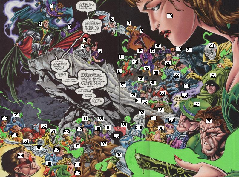 Pages 30 and 31: Neron speaks to the assembled villains. The two page spread is scanned and numbered on the side with the key below. The numbers start in the top left then work clockwise round the main balcony area, sweep left along the floor and then back up and to the right to finish with the small group in the middle.
