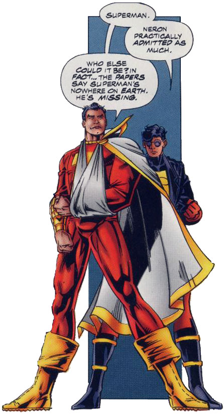 Page 36 – Panel 4: “Superman.” says Captain Marvel with Superboy backing him up. Superman, as Marvel says, is “nowhere on Earth” at this time as, unknown to the heroes, he was off-planet and facing the Trial of Superman.