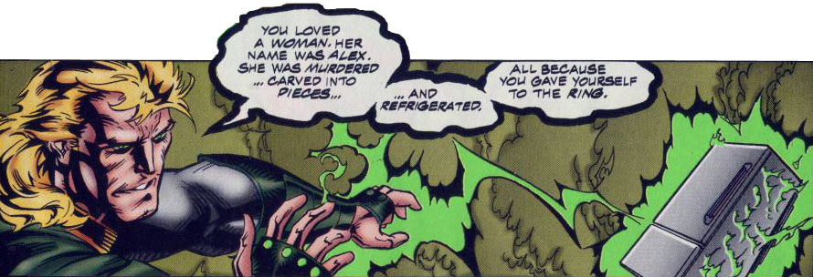 Page 25 – Panel 3: Neron refers to Alexandra ‘Alex’ DeWitt, former girlfriend of Green Lantern who was murdered by Major Force and, as Neron says, stuffed into Lantern’s refrigerator. As an aside, anyone with an interest in comic book analysis will likely have come across a site involving noted comic book author Gail Simone; the site’s called Women In Refrigerators: (in case that link goes down, here’s the connected Wikipedia article) which examines why many female characters in comics end up being killed, depowered or injured simply as a plot device. The site takes its name from the incident mentioned above in GREEN LANTERN #54 when Alex DeWitt was killed and is well worth a read.