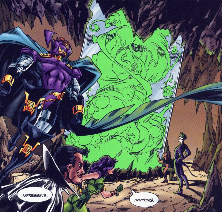 Page 9 – Panels 4 and 5: And Flash’s heart’s desire? The return of Barry Allen, his uncle and the man who wore the Flash suit before him. Allen died in CRISIS ON INFINITE EARTHS and, when UNDERWORLD UNLEASHED was published in 1995, was one of the few major comics characters to have died and remained dead.