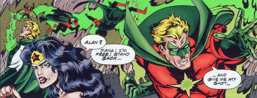 Page 27 – Panel 2: Flash, Green Lantern, Wonder Woman and Warrior (and presumably Martian Manhunter as well) are all brought to their senses.