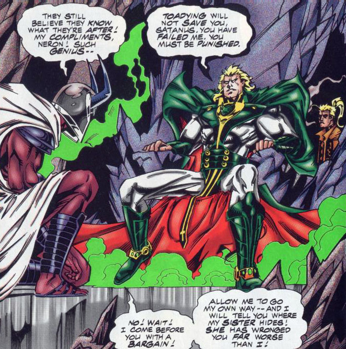 Page 6 – Panel 2: Behind Neron’s throne is the Trickster while Satanus kneels in front of him. Neron is unhappy with the former’s actions which took place in PRIMAL FORCE #13 and #14 (thanks to Mike Choman for providing that info.) Satanus is more than willing to sell out his own sister to save his own hide . . .